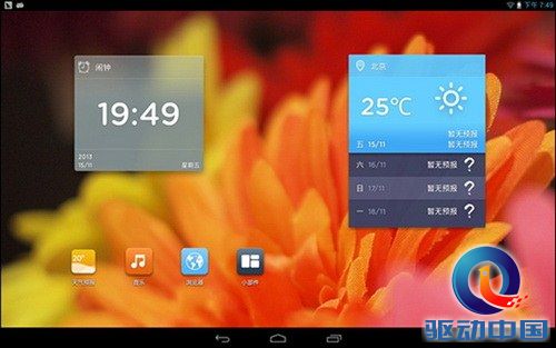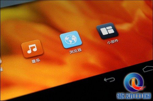 同大多数的平板相同,蓝魔i9的系统UI分上下两栏,虚拟按键在下侧,上侧为系统通知栏。电池图标与原生不同经过了美化,虚拟按键处建议下版固件能增加音量加减键。滚屏效果与原生安卓大致相同,不同系统程序菜单与快捷方式菜单融合到了一起,这点类似MIUI等美化系统,取消了程序抽屉界面。